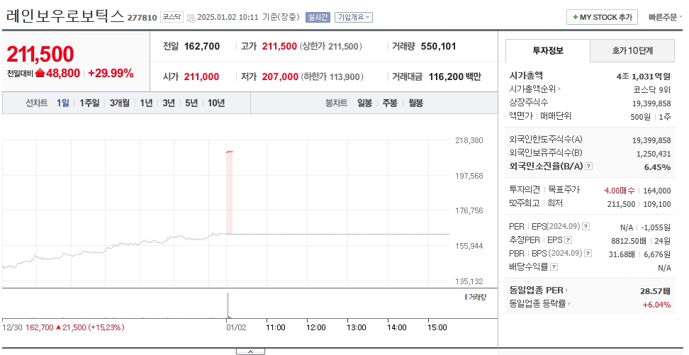 다음은 레인보우로보틱스의 주가 확인 및 주가 전망을 알아보겠습니다. 삼성전자 자회사로 편입되며 많은 증권사에서는 향후 주가의 전망을 좋게 보고 있습니다. 2025년 주식 시장 개장과 동시에 좋은 주가가 전망되고 있습니다.