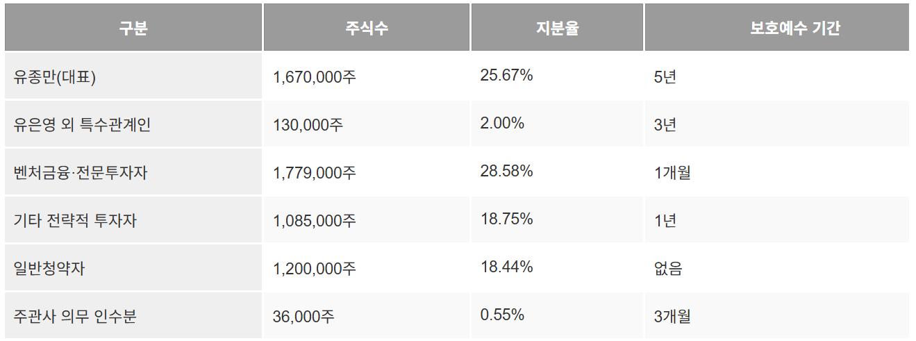 • 보호예수 다수: 최대주주 5년, 전략적 투자자 1년