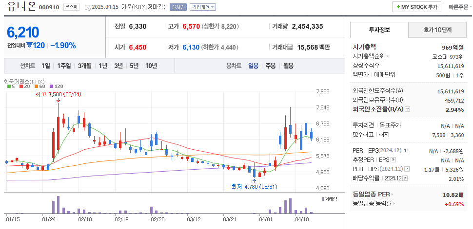 2025년 4월 초 기준, 유니온 주가는 중국의 희토류 수출 제한과 관련된 반사이익 기대감으로 급등했습니다. 4월 7일 최고가 7,350원을 기록한 뒤 4월 10일 기준 5,810원으로 다소 조정된 상황입니다.