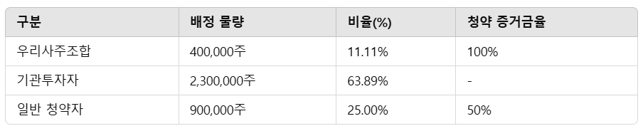 기관투자자와 일반 청약자에게는 각각 63.89%와 25.00%가 배정되었으며, 특히 일반 청약자들은 청약 증거금율 50%를 적용받아 상대적으로 적은 초기 자금으로 참여할 수 있습니다.