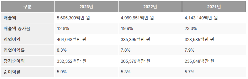 LGCNS는 꾸준한 매출 성장과 수익성 개선을 보여주고 있으며, 특히 영업이익률이 2023년 8.3%로 상승했습니다.