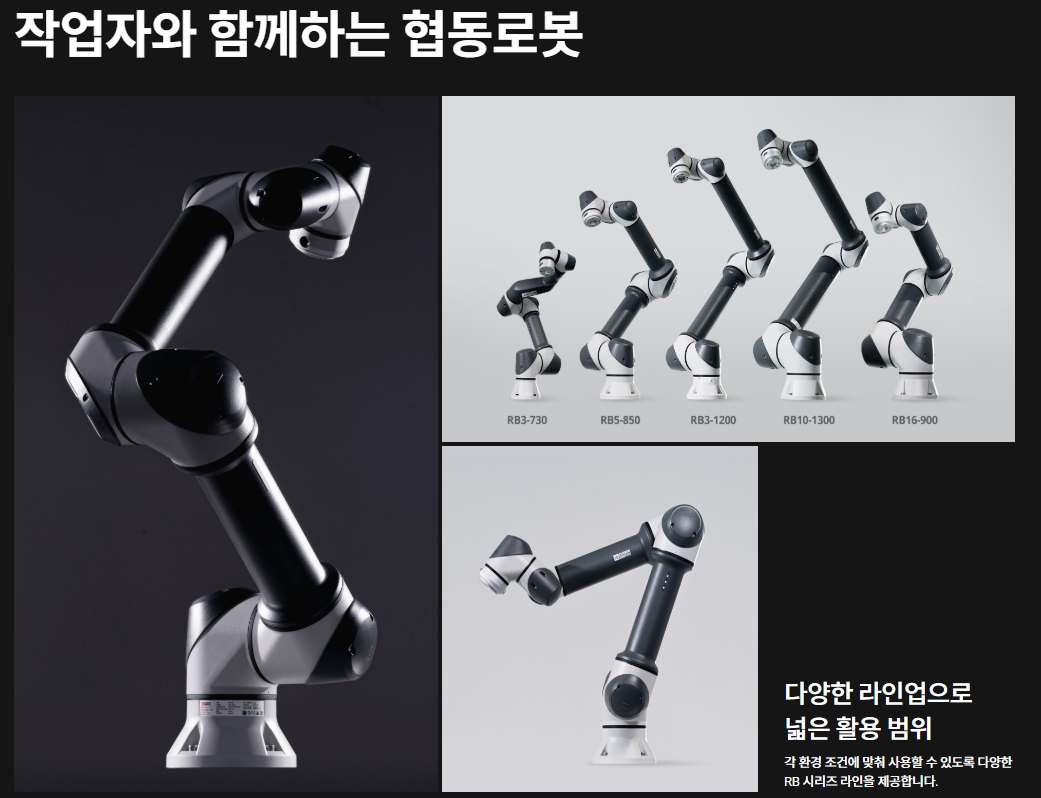 산업 현장에서 인간과 협력하여 작업할 수 있도록 설계된 협동로봇 RB3, RB5, RB10은 사용이 쉽고 비용 효율적이며, 레인보우로보틱스의 독보적인 기술력이 담긴 제품입니다.