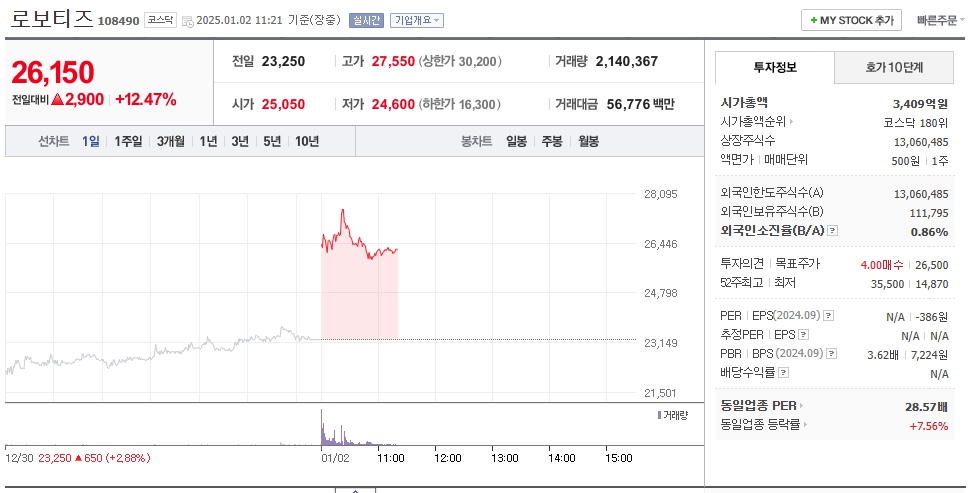 로보티즈의 주가는 2024년 11월 19일, 전일 대비 15.93% 상승하며 21,700원에 거래를 마쳤습니다. 최근 급등은 MIT와의 협력, 외국인 투자 증가, 실적 개선, 국내외 협력 확대 등 다양한 긍정적 요인이 복합적으로 작용한 결과입니다.