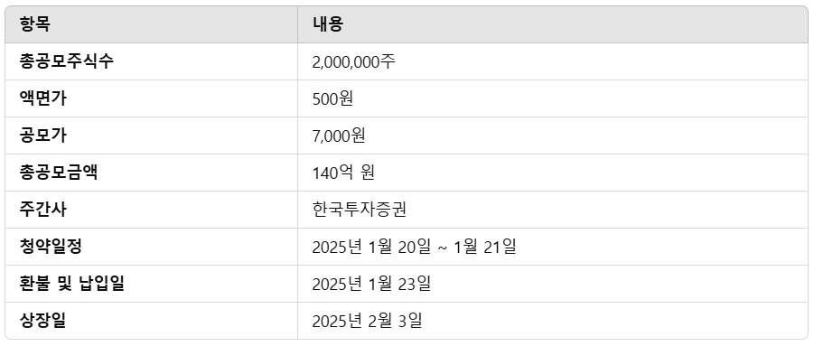 이번 공모는 한국투자증권이 주간사로 진행하며, 일반 청약자는 2025년 1월 20일부터 21일까지 청약을 신청할 수 있습니다. 청약 증거금은 총 청약 금액의 50%를 납부해야 하며, 환불일과 납입일은 모두 1월 23일로 동일합니다.