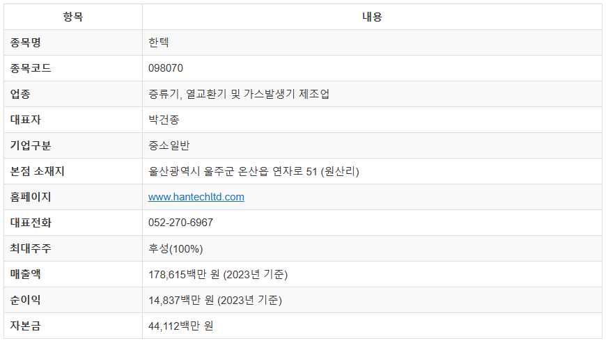 한텍은 국내외 플랜트 시장 확장과 해외 수출 증가를 통해 장기적으로 성장할 가능성이 높은 기업입니다. 다만, 단기적인 주가 변동성을 고려하여 신중한 투자 접근이 필요합니다.